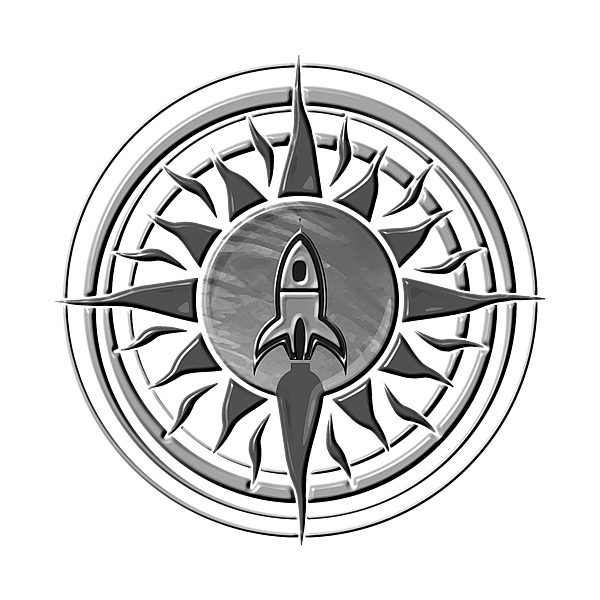 Symbolic silver rocket over a flaming tribal star in grayscale.